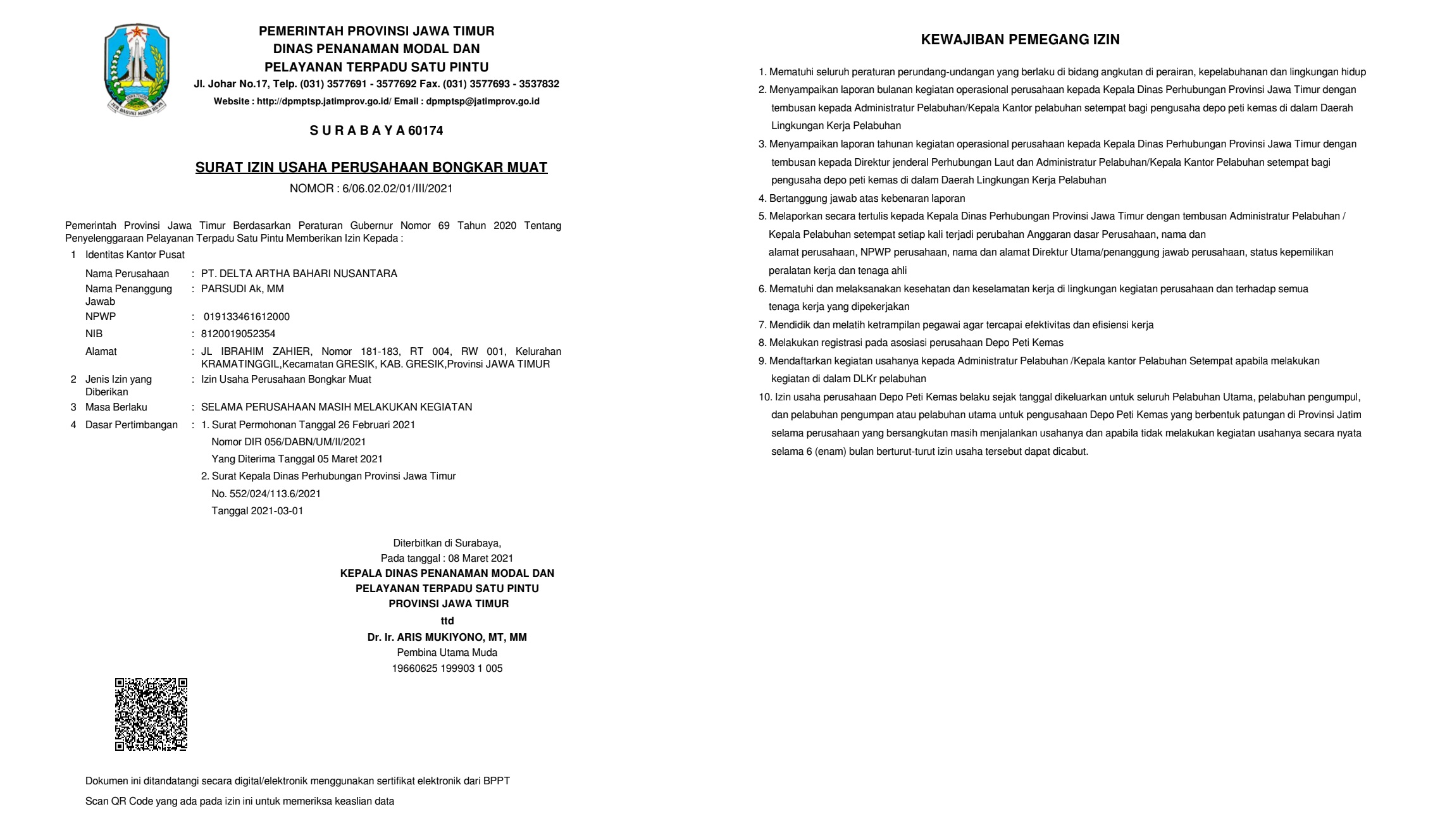 Seperti diberitakan sebelumya, penelusuran Jurnal3, PT DABN yang kedudukannya di Pelabuhan Probolinggo juga sebagai Badan Usaha Pelabuhan (BUP) itu diketahui memiliki SIUPBM Nomor: 6/06.02.02/01/III/2021, yang diterbitkan oleh Dinas Penanaman Modal dan Pelayanan Terpadu Satu Pintu Provinsi Jawa Timur pada 8 Maret 2021 silam, yang ditandatangani oleh Kepala Dinas Dr. Ir. Aris Mukiyono, MT, MM.